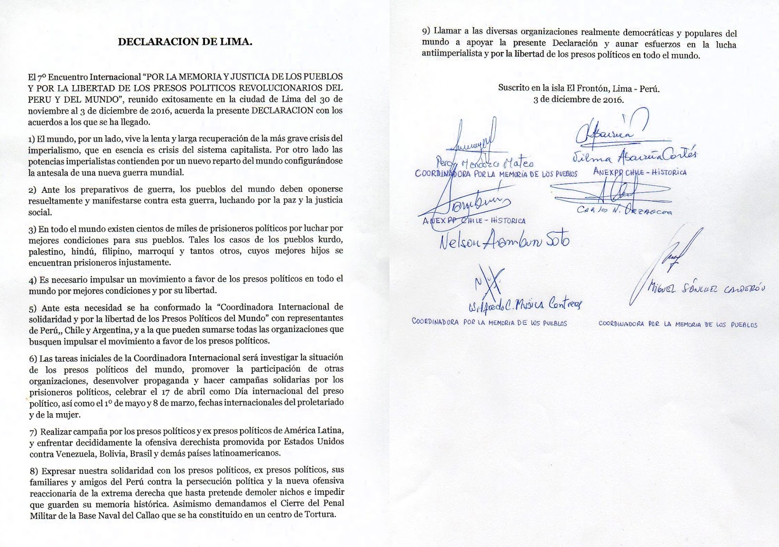 Estimad@s compas, desde el 29 de noviembre al 3 de diciembre se realizó en Lima el VII Encuentro Internacional de ex presos políticos revolucionarios.El 7mo Encuentro Internacional «POR LA MEMORIA Y JUSTICIA DE LOS PUEBLOS Y POR LA LIBERTAD DE LOS PRESOS POLÍTICOS REVOLUCIONARIOS DEL PERÚ Y DEL MUNDO», reunido exitosamente en la ciudad de Lima del 30 de noviembre al 3 de diciembre de 2016, acuerda la presente DECLARACIÓN con los acuerdos a los que se ha llegado.
