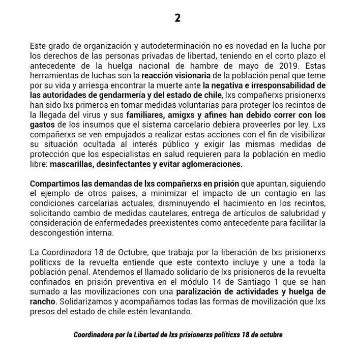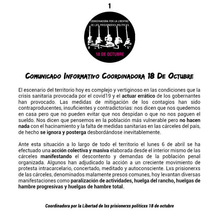 Hacemos un llamado a todx individuo, organización, colectivx y asamblea a solidarizar y apoyar a quienes se encuentran privadxs de libertad. Hoy más que nunca hagamos eco de sus voces y de sus exigencias. #LibertadALxsPresxsPoliticxs #PresxsTambienEnCasa