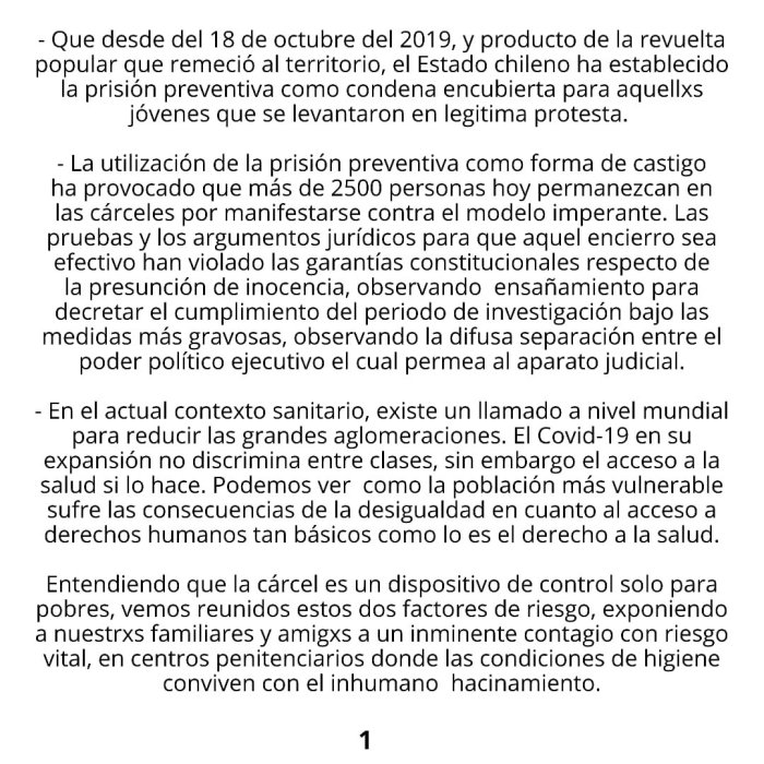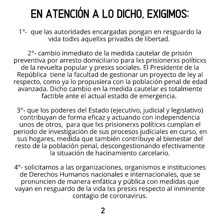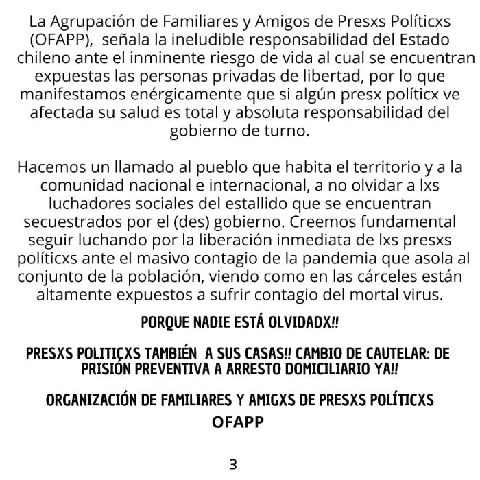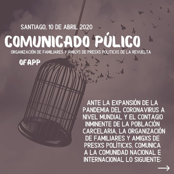 Comunicado de la Organización de Familiares y Amigxs de Presxs Políticos de la Revuelta: Ante la expansión de la pandemia del coronavirus a nivel mundial y el contagio inminente de la población carcelaria, la OFAPP, comunica a la comunidad nacional e internacional lo siguiente