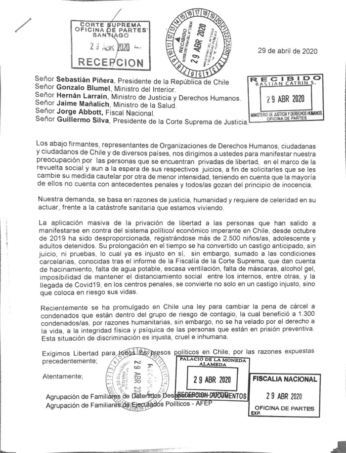 Los abajo firmantes, representantes de Organizaciones de Derechos Humanos, ciudadanas y ciudadanos de Chile y de diversos países, nos dirigimos a ustedes para manifestar nuestra preocupación por las personas que se encuentran privadas de libertad, en el marco de la revuelta social y aun a la espera de sus respectivos juicios, a fin de solicitarles que se les cambie su medida cautelar por otra de menor intensidad, teniendo en cuenta que la mayoría de ellos no cuenta con antecedentes penales y todos/as gozan del principio de inocencia.