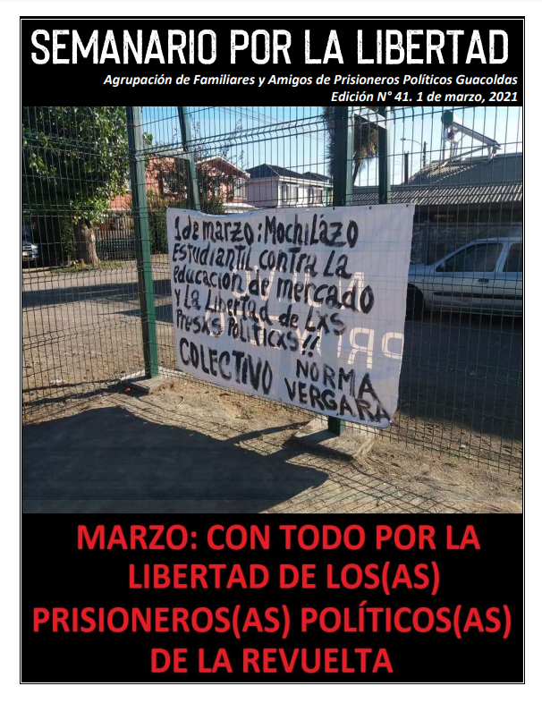 (Editorial) Tras un receso durante el mes de febrero, como Guacoldas hemos retomado el trabajo del Semanario por la Libertad, instrumento de instalación y difusión de ideas para la Batalla por la Libertad. Este número llega en pleno despliegue de la apuesta de un Marzo de Rebeldía Popular y Mapuche, cuyo centro está en apurar los procesos de movilización y de encuentro en la praxis, a través de la ideas, entre el Gigante Popular y el Pueblo Mapuche, instalando dos ejes que recorren a los Pueblos en Chile: exigir el cese a las constantes, sistemáticas y masivas violaciones a los Derechos Humanos cometidas por el Estado de Chile y por la institucionalidad democrática y la exigencia de libertad a los(as) prisioneros(as) políticos(as).
