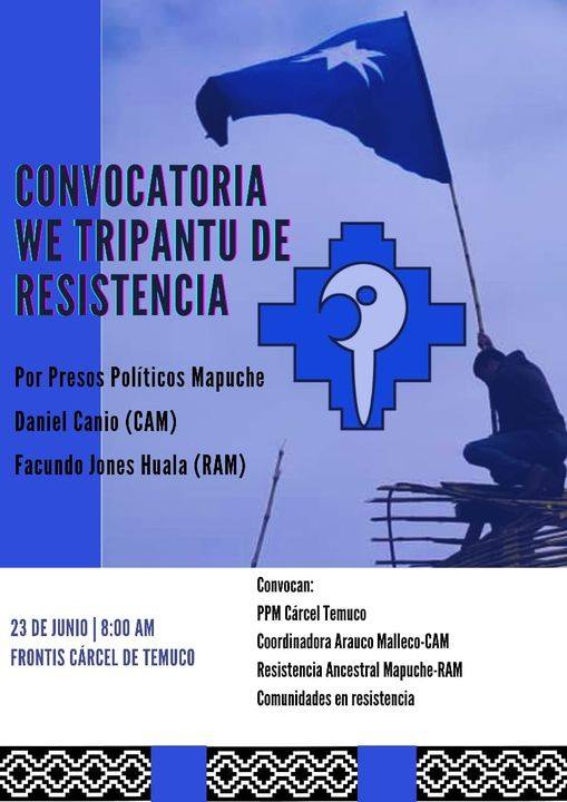 COMUNICADO PUBLICOLos PPM en la cárcel de Temuco militantes del movimiento revolucionario Mapuche, Daniel Canio Tralcal (CAM) y Facundo Jones Huala (RAM-MAP) venimos a manifestar lo siguiente:Invitar a nuestras Lof y al conjunto de nuestro Pueblo a acompañarnos en el Wiñoy Tripantü de Resistencia Mapuche que en conjunto con los demás peñi PPM convocamos desde la cárcel para el miércoles 23 de Junio desde las 08:00 hrs. El que se realizará a su vez, en el frontis de la cárcel.Esta invitación es a todos nuestros pu peñi ka pu lamien a conmemorar We Tripantü como un hecho político de resistencia, reafirmamos así nuestro compromiso militante en la lucha de Liberación Nacional Mapuche, luchando frontalmente contra el latifundio, forestales, transnacionales y todos los intereses capitalistas y modelo colonial que operan y mantienen ocupado y oprimido nuestro Territorio Ancestral en Gulumapu y Puelmapu.No creemos en las trampas del sistema, en su institucionalidad, sus políticas integracionistas ni en sus migajas, no creemos ni queremos escaños reservados ni proceso constituyente, sino Recuperar todo nuestro territorio, Reconstruir nuestro mundo, expulsar a los opresores y Liberarnos como Pueblo – Nación mapuche.Territorio, Autonomía, Resistencia, Reconstrucción y Liberación Nacional Mapuche
