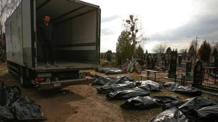 El analista también llamó la atención sobre que la mayoría de los cuerpos que aparecen en el vídeo tienen una venda blanca en la manga, que era lo que los habitantes de Bucha las ponían para decir a los rusos: «no estamos con el Gobierno, no nos maten». También constató que «al lado de cada cuerpo estaba la caja verde de la ración de soldado, la que ellos llevaban en el momento de ser baleados».