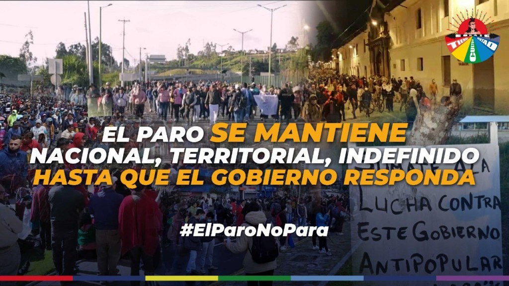El movimiento popular e indígena continuará la huelga indefinidamente en todo el país para enfrentar las medidas antisociales del régimen autoritario y de extrema derecha de Guillermo Lasso, y hasta que el gobierno no ofrezca respuestas reales a las reivindicaciones sociales que persiguen un mejor vivir.