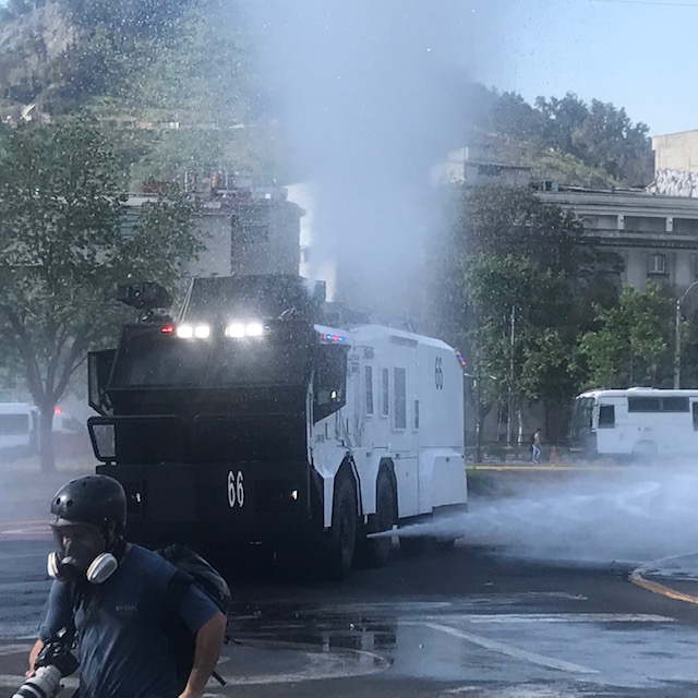 El día de ayer, con ocasión del 18 O, y la interrupción del tránsito en el centro, al volver a casa caminando, me detuve un rato en el cerro Santa Lucía y tuve ocasión de observar que sin que mediara provocación ninguna, cada cierto tiempo, los vehículos policiales, pasaban -solos y en grupos-, a toda velocidad de ida y vuelta. Lo que me pareció notable y el objeto de esta pregunta, es que -tal como hemos visto en las emisiones de noticias en la TV-, al paso de dichos vehículos policiales, junto a las sirenas activadas, se escuchaban con estruendo, los golpes de piedras e incluso explosiones, que uno atribuye a las acciones de los manifestantes. Me tomó largo rato darme cuenta, que como no había manifestantes beligerantes y los sonidos de las piedras y objetos contundentes, se reproducían iguales, al veloz paso de los vehículos, que se trataba de grabaciones, difundidas por los altoparlantes de los propios carros policiales. Por medio de la Ley de Transparencia, hago en consecuencia las siguientes preguntas a la autoridad: