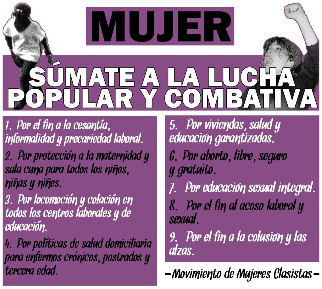 Las mujeres trabajadoras y populares luchamos por los justos derechos que, como trabajadoras y mujeres, tenemos. Luchamos por derechos laborales, sociales, de género, de la niñez y juventud popular.