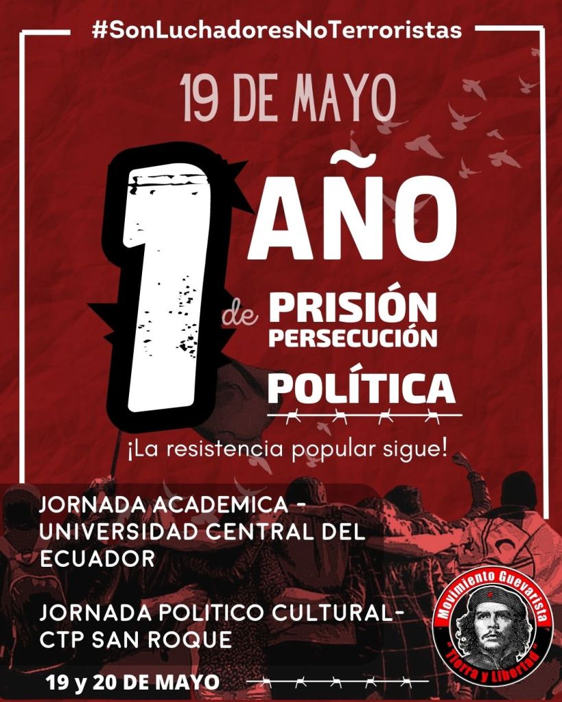 Este 19 de mayo se cumple un año de prisión política de tres integrantes del Movimiento Guevarista Tierra y Libertad del Ecuador, y a diferencia de lo que esperaba la derecha y el gobierno fascista de este país, la resistencia popular sigue.