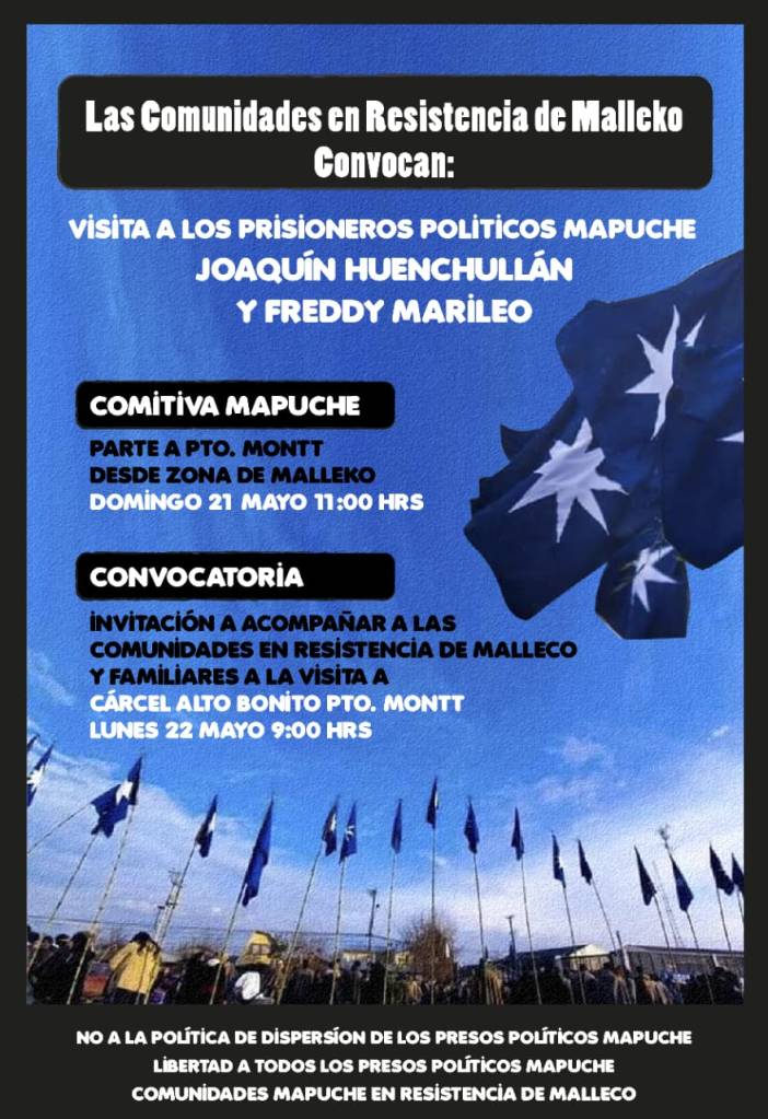 Las comunidades de Malleko en resistencia invitan a acompañarles a visitar a los Presos Políticos Mapuche Joaquín Huenchullán y Freddy Marileo, a la cárcel Alto Bonito de Puerto Montt, el lunes 22 de mayo, a las 9am, a donde fueron trasladados arbitrariamente por Gendarmería.