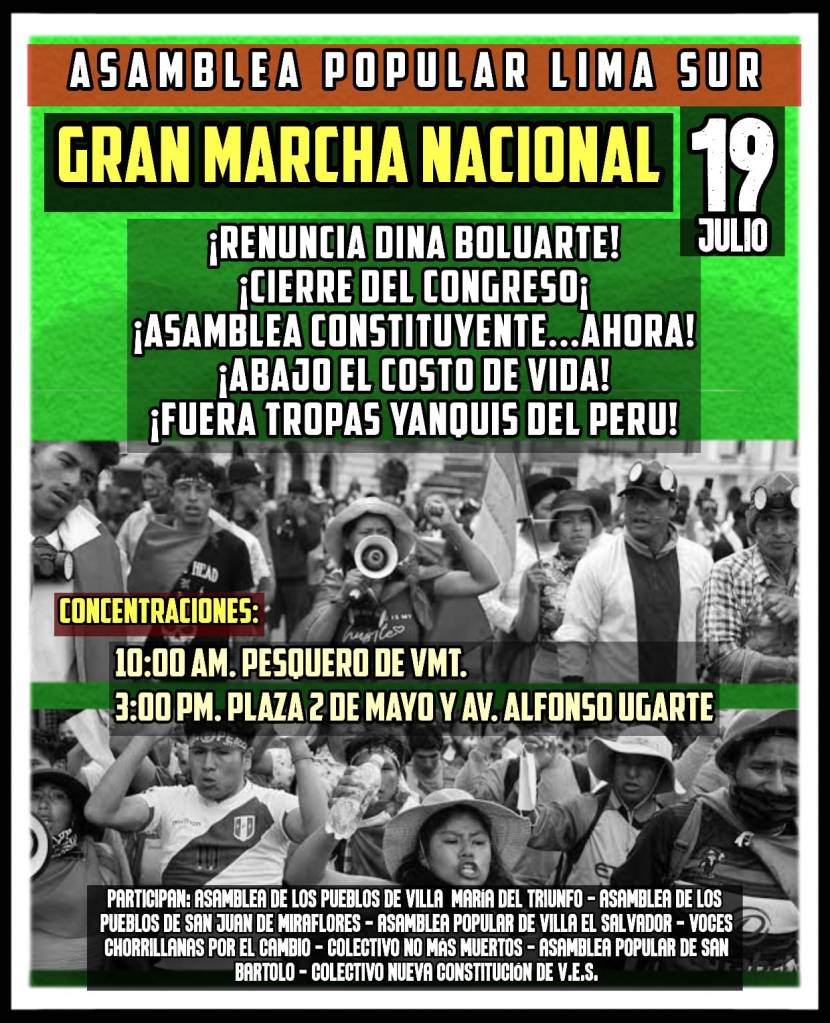 La Coordinadora Nacional Unitaria de Lucha (Conulp) convocó a todas las regiones del Perú a la Gran Marcha de lo Pueblos a Lima para comenzar la jornada de lucha a partir del 19 de julio, hasta que caiga la dictadura de Dina Boluarte, representante de los intereses del gran empresariado y del imperialismo en el país andino.