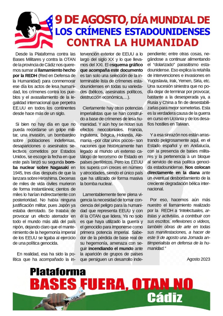 Desde la Plataforma contra las Bases Militares y contra la OTAN de la provincia de Cádiz nos queremos sumar al llamamiento hecho por la REDH (Red en Defensa de la Humanidad) para conmemorar ese día los actos de lesa humanidad, los crímenes contra los pueblos y el avasallamiento de la legalidad internacional que perpetra EE.UU en todos los continentes desde hace más de un siglo…