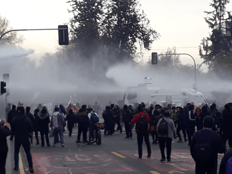 A través de nuestra Comisión de Observadores/as de Derechos Humanos, junto con seis Observadores/as de la Comisión por la Memoria de la provincia de Buenos Aires (Mecanismo Local de Prevención de la Tortura) y de organizaciones históricas de Derechos Humanos de Argentina, fuimos testigos/as directos/as de cómo se limitó el acceso a la marcha en la Alameda, instalando vallas en la esquina de San Diego, Bandera, San Martín y Lord Cochrane, haciendo a la gente caminar confundida y sin saber cómo acceder o seguir la marcha. Del lado de adentro de este encapsulamiento se encontraba personal de Carabineros con chaqueta blanca, llamados “Agentes de Diálogo”, que portaban pistola, bastón retráctil y algunos además portaban gas pimienta. Los acompañaban carabineros con chaqueta de color amarillo, con la sigla DDHH en su chaqueta, quienes también portaban pistola y gas pimienta. En el exterior de las vallas de Alameda con San Diego, se encontraba un hombre civil, portando la bandera de un partido político de izquierda, que preguntaba a quienes solicitaban ingresar al sector de la marcha: “¿de qué partido es usted?”, indicando a los carabineros de chaqueta blanca quién podía ingresar y quién no. Esto que observamos nos parece absolutamente irregular y atenta contra los estándares del Derecho de Manifestación y Reunión, además de atentar contra el principio de los Derechos Humanos de Igualdad y No Discriminación. Cuando diferentes grupos de manifestantes que avanzaban por la Alameda quisieron sumarse a la columna de la marcha y se toparon con las vallas, la respuesta desproporcionada frente a los reclamos de poder pasar fue arrojar con los camiones hidrantes, agua con un ácido que ocasionaba erupciones y dolores en la piel.