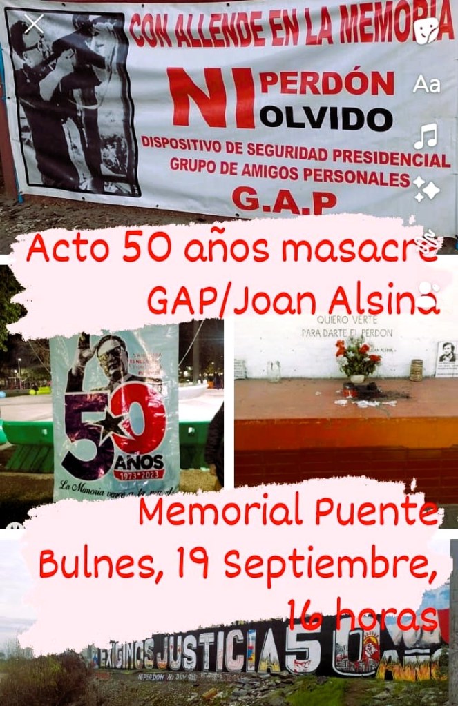 Este 19 de septiembre, en Santiago, a partir de las 16 horas, se realizará un acto de homenaje a un sacerdote y a 9 miembros del GAP (Dispositivo de Seguridad Presidencial de Salvador Allende), que fueron masacrados por militares hace 50 años.