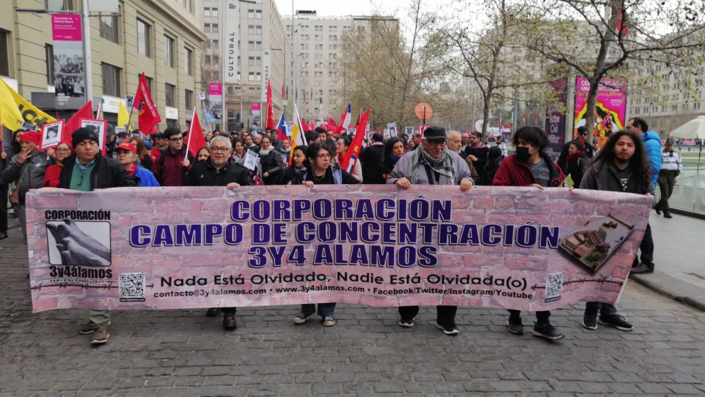 A 50 años del Golpe de Estado Civil y Militar, como Corporación Campo de Concentración 3y4 Álamos, lugar de detención, tortura y desaparición de compatriotas. Repudiamos el actuar de Carabineros, quienes continúan actuando como lo hacían durante en dictadura y en completa impunidad, sin respeto, ni consideración hacia las personas que participaban en la marcha, entre las cuales se encontraban familiares de detenidos y detenidas desaparecidas, ejecutados y ejecutadas políticas, sobrevivientes, niños, niñas, adultos y adultas mayores, reporteros gráficos e invitados internacionales.
