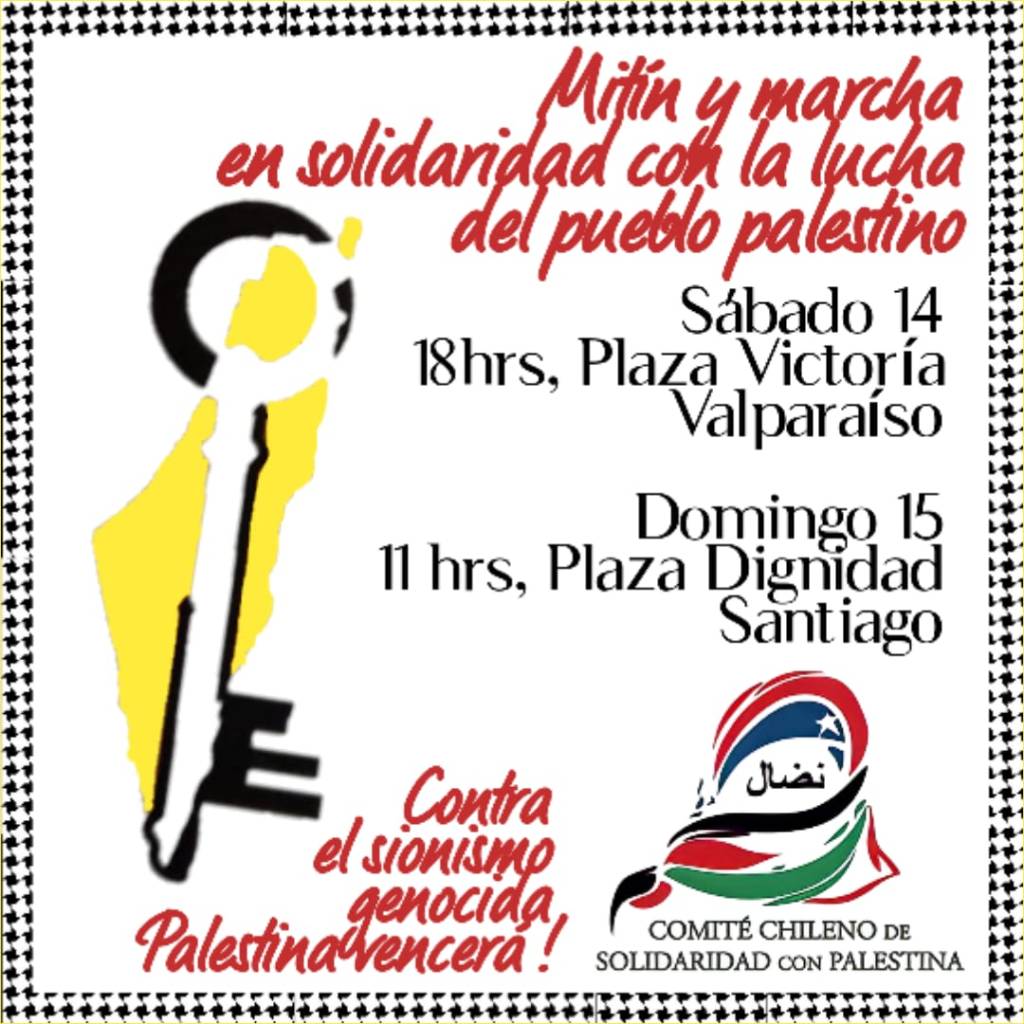 Las organizaciones abajo convocantes hacen un llamado a manifestarse en la Plaza Dignidad, Santiago, el domingo 15 de octubre a las 11 am, y el 14 de octubre a las 18 Hrs., en Plaza Victoria, Valparaíso, en apoyo a la resistencia del Pueblo Palestino contra la agresión imperialista sionista intolerante ante los pueblos que buscan su libertad y derecho a vivir sin ocupación, sumisión ni explotación.