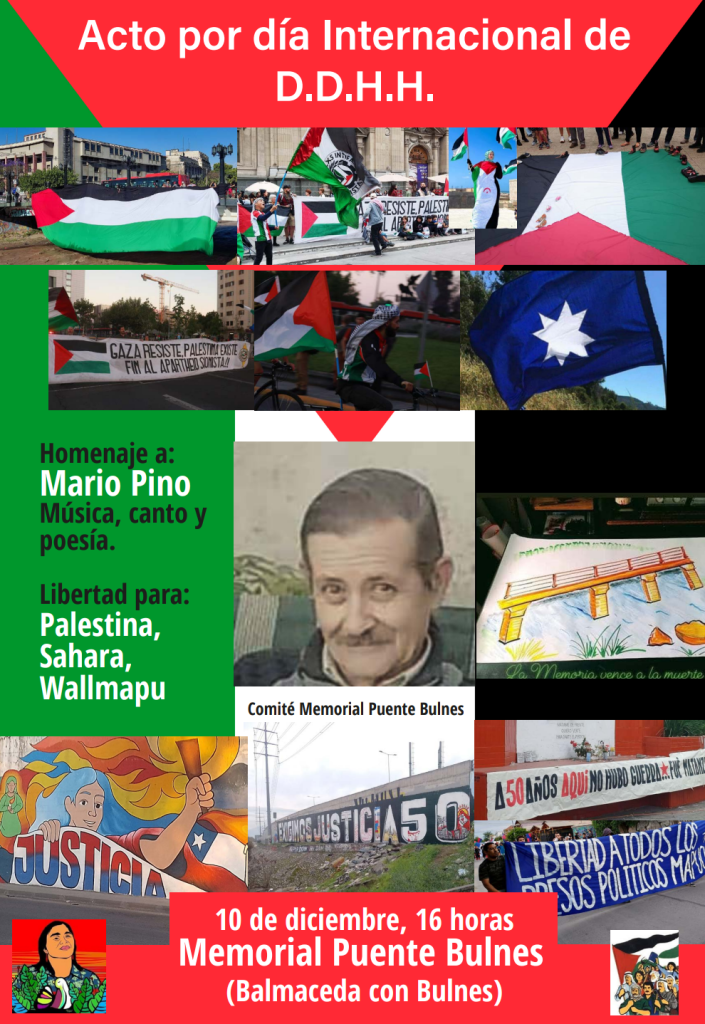 Este domingo 10 de diciembre, día internacional de los derechos humanos 2023, estará dedicado a los pueblos en resistencia, por lo que tendremos intervenciones de Dalal, por el pueblo palestino; Aliwen, por el pueblo mapuche; Esteban, por el pueblo saharaui. Se rendirá homenaje a Mario Pino, colaborador recientemente fallecido, con un testimonio sobre su vida, así como con poesía. Habrá un par de poemas para quienes han partido, con Aquiles y Jorge, del Taller Literario La Motita.