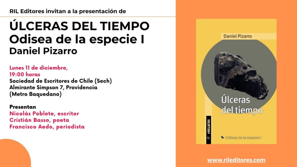 Este 11 de diciembre, a las 19.00 horas, en la Sociedad de Escritores de Chile, Sech, ubicada en calle Simpson 7, comuna de Providencia, el narrador Daniel Pizarro lanza su última obra ‘Úlceras del tiempo’, de su colección ‘Odisea de la especie 1’.