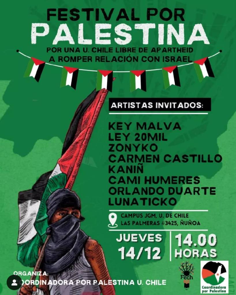 La Coordinadora por Palestina de la Universidad de Chile organiza y convoca al Festival por Palestina, por una Universidad de Chile libre de apartheid a romper relaciones con Israel.