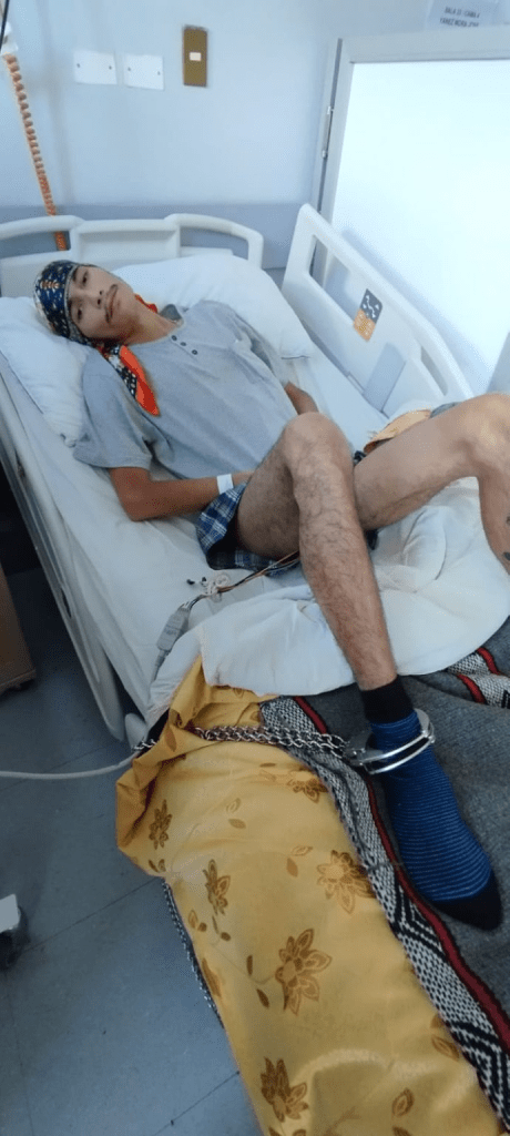 La pareja de Esteban Henríquez, Valeria Barra, aseguró a CIPER que el huelguista no ha querido aceptar el suero de rehidratación que le ofrecen en el hospital: “Está muy decaído. Le están controlando en todo momento los signos vitales, lo mantienen engrillado de los pies a la cama, por lo que no puede trasladarse al baño libremente. Los niveles de glicemia en sangre están en el límite bajo, la presión ha estado estable, pero también en un nivel bajo. Está todo el rato con mareos, dolores de cabeza, escucha un sonido como un pito, se le tapan los oídos, tiene dolor de estómago, dolor corporal. Hay días en que le cuesta mantenerse despierto. Él tiene decidido continuar con la huelga de hambre y, si bien en el hospital le ofrecen suero de rehidratación, siempre lo rechaza. Está determinado a seguir con la huelga hasta las últimas consecuencias”.