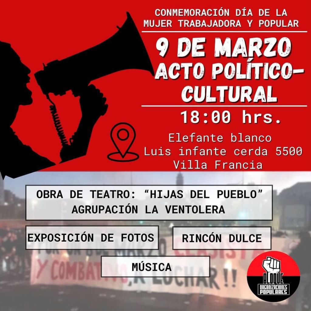 Este 9 de marzo queremos dejarles invitadxs a participar de una actividad político-cultural en el marco de la conmemoración del día de la mujer trabajadora. Contaremos con la exposición de la obra de teatro »Hijas del pueblo», recordando a aquellas mujeres que tomaron el camino de luchar ante la injusticias de este sistema.
