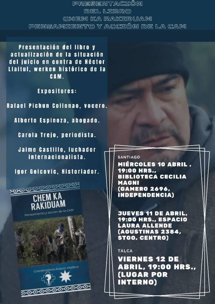 Presentación del libro Chem Ka Rakiduam (Pensamiento y acción de la CAM), y actualización en torno al juicio contra Héctor Llaitul, werken histórico de la CAM.