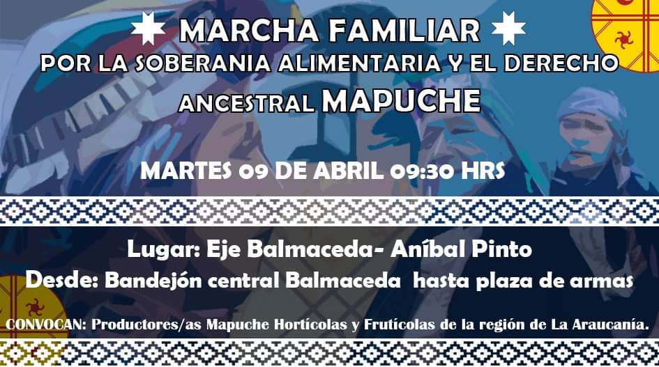 Este 9 de abril, en el centro de Temuco, se realizó una marcha familiar mapuche por la soberanía alimentaria y los derechos ancestrales mapuche.