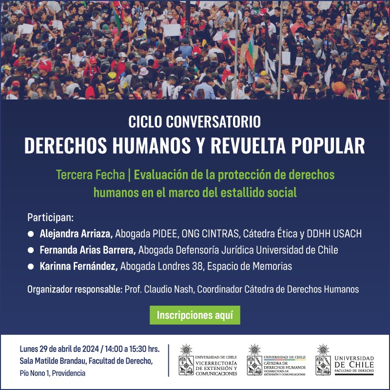 Este lunes 29 de abril, desde las 14:00 horas, se realizará en la Facultad de Derecho de la Universidad de Chile (Pionono 1) la tercera fecha del Ciclo conversatorio DD.HH. y revuelta popular. En el conversatorio estarán las abogadas de derechos humanos Alejandra Arriaza, Karinna Fernández y Fernanda Arias. Inscripciones al correo: vexcom@u.uchile.cl