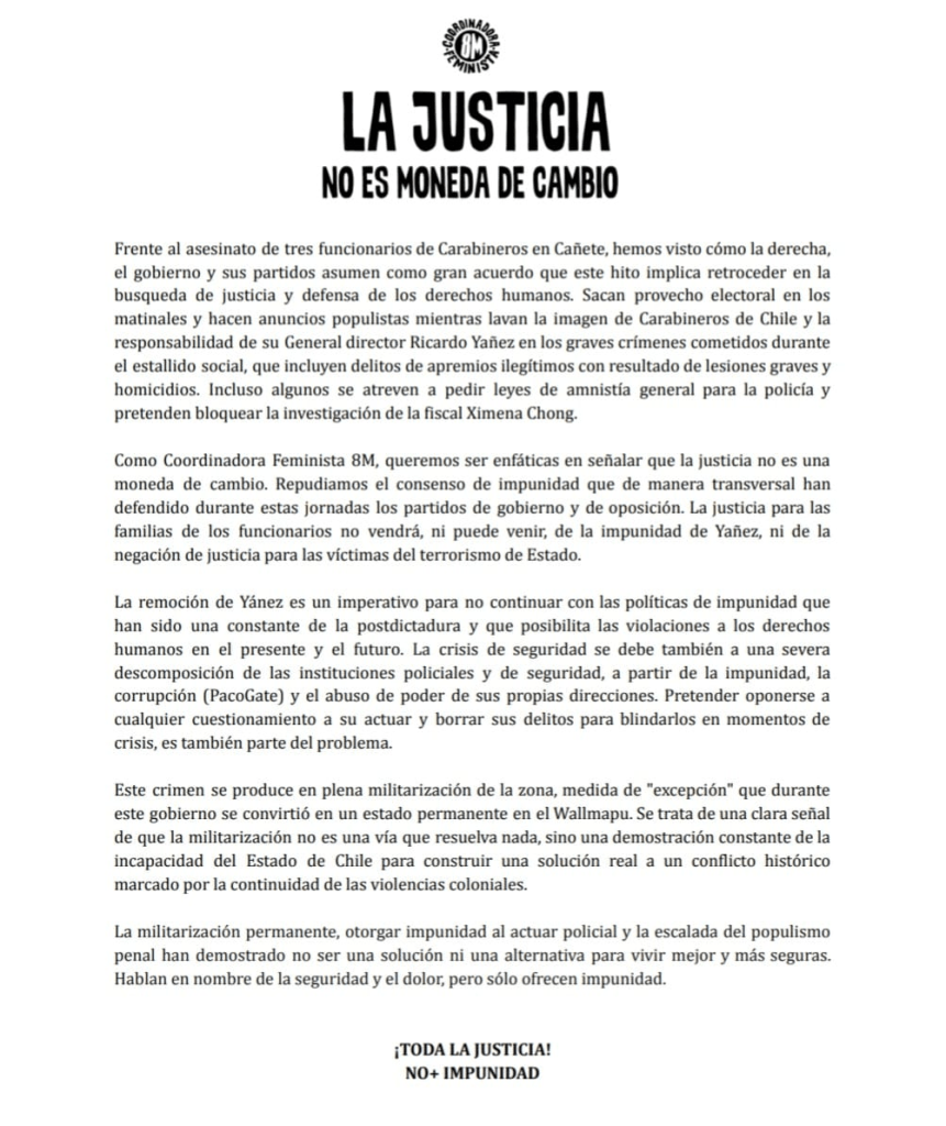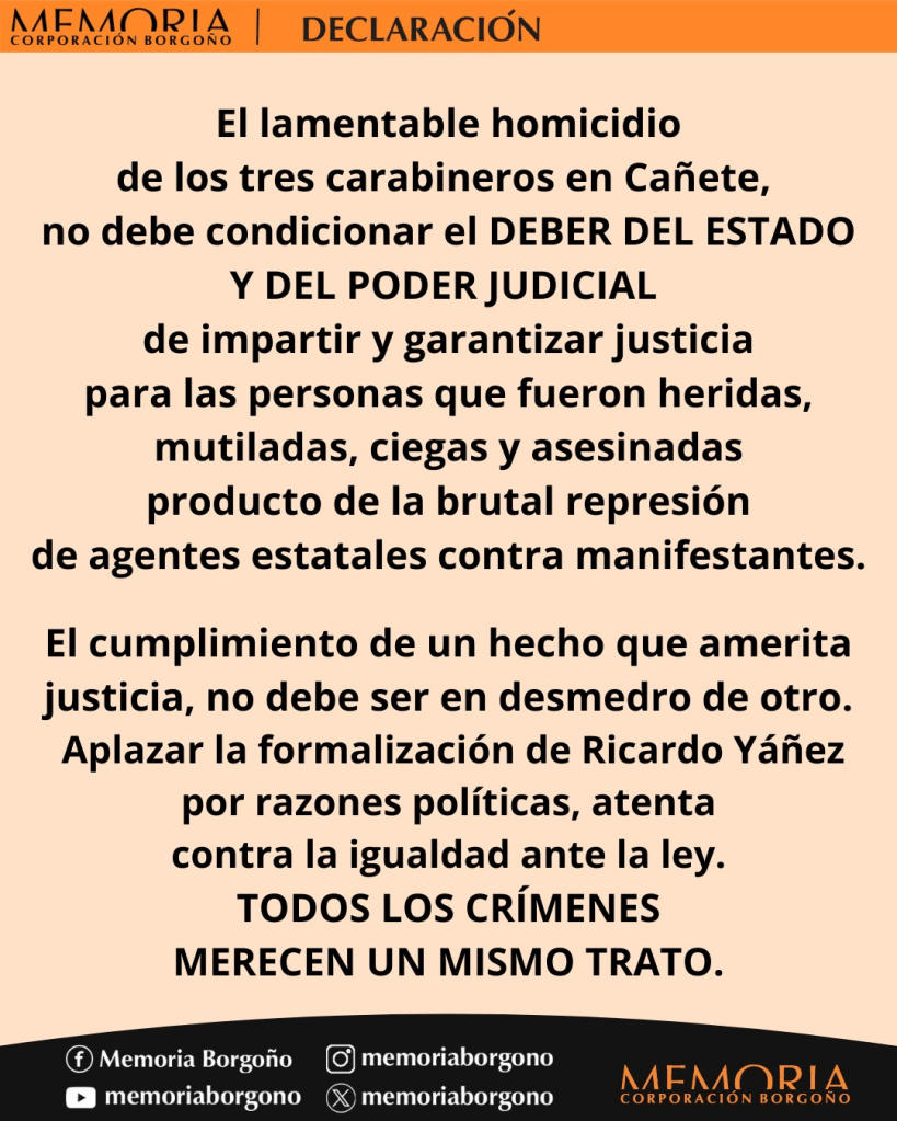 Por ello, el asesinato de tres carabineros en Cañete, y la necesidad de su esclarecimiento, no debe ser utilizado como argumento para impedir o ralentizar la también necesaria investigación de los crímenes cometidos por agentes del Estado y la formalización de sus responsables. Estos delitos han sido denunciados y establecidos por numerosos informes nacionales e internacionales.