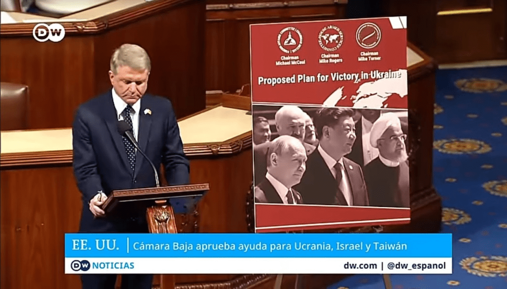 Antes de esta autorización presidencial, el noticiario de DW informaba que la Cámara Baja estadounidense había aprobado el referido paquete de ayuda militar y mostraba, en pantalla, en el Congreso estadounidense, a un representante hablando en la sala y donde, a sus espalda, había una foto en un atril con las imágenes del presidente de Rusia, Vladimir Putin; Xi Jinping, de China; y Ebrahim Raisol-Sadati, de Irán.
