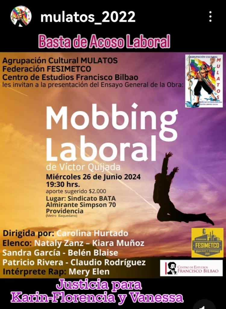 El próximo 26 de junio, se presentará el ensayo general de la obra teatral «Mobbing Laboral» de la agrupación cultural Mulatos, a las 19.30 horas, en el Sindicato Bata ubicado en la calle Almirante Simpson 70, comuna de Providencia (muy cerca del metro estación Baquedano), Santiago.