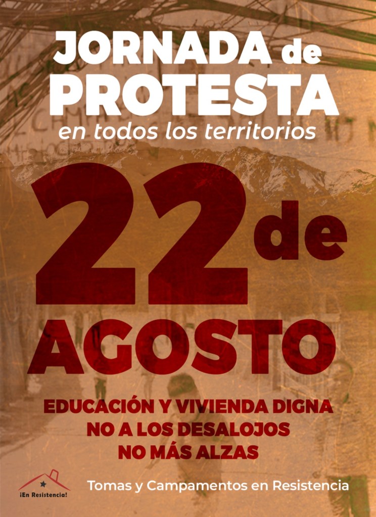 Nos reunimos estudiantes, pobladores, campamentos, comités de vivienda, pueblo trabajador y organizaciones sociales para articular una jornada de protesta este próximo jueves 22 de agosto debido a la precariedad en la que estamos viviendo las distintas comunidades a lo largo y ancho del país, y que requieren de forma urgente una respuesta.