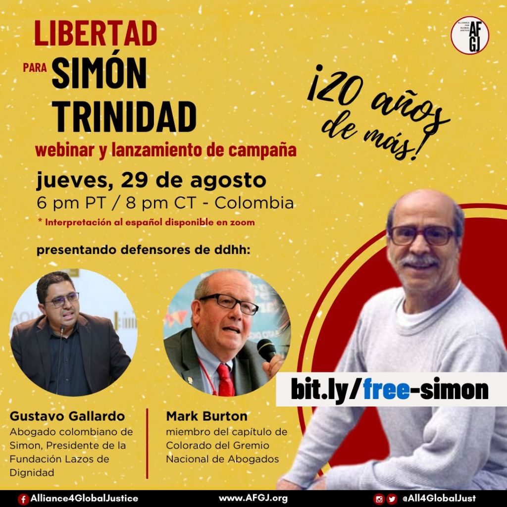 El próximo jueves 29 de agosto, únete a nosotros para escuchar a Mark Burton y Gustavo Gallardo, abogados estadounidenses y colombianos del preso político estadounidense Simón Trinidad (Ricardo Palmera), mientras lanzamos una campaña por la repatriación de Trinidad a Colombia.