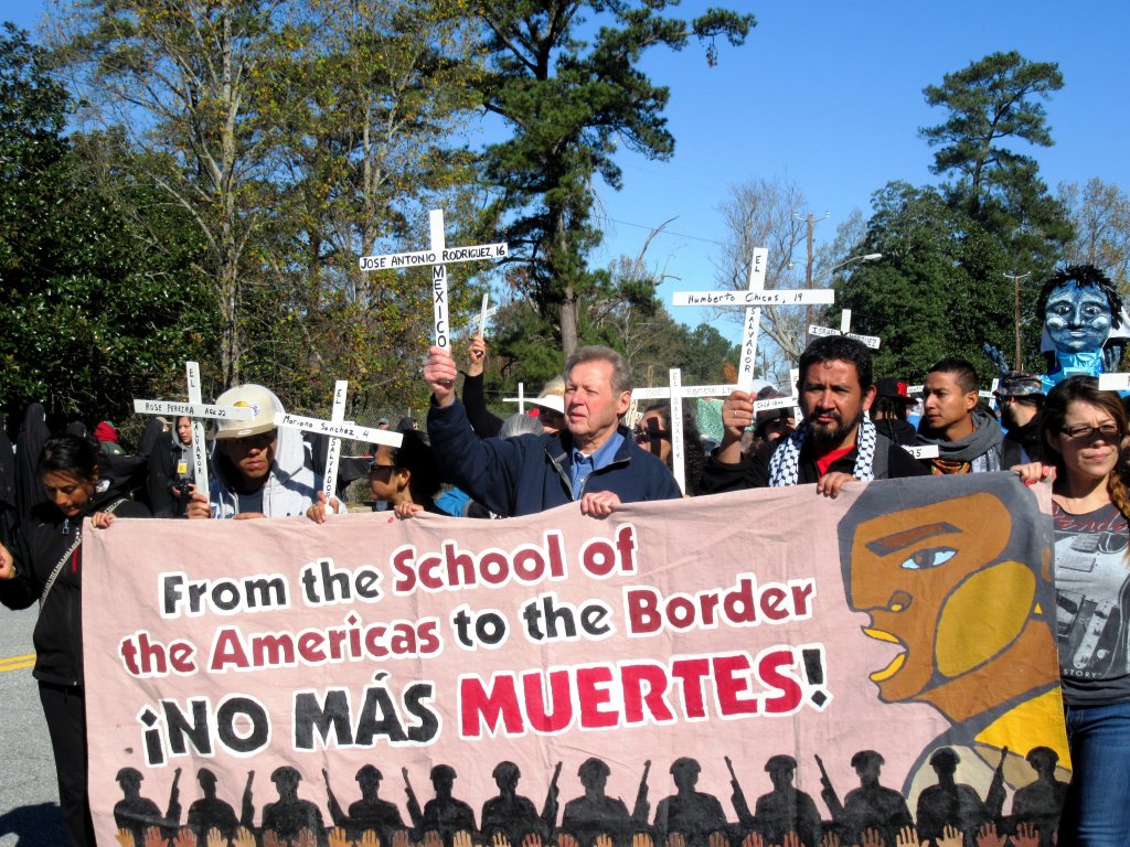 Foto Archivo: Pablo Ruiz al lado izquierdo del ex sacerdote Roy Bourgeois fundador en Estados Unidos del movimiento contra la Escuela de las Américas (2015).