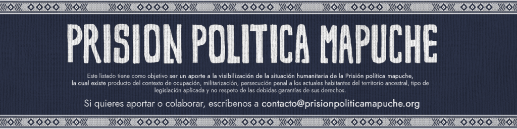 Este listado tiene como objetivo ser un aporte a la visibilización de la situación humanitaria de la prisión política mapuche. Producto del contexto de ocupación, militarización, persecución penal a los actuales habitantes del territorio ancestral, tipo de legislación aplicada y no respeto de las debidas garantías de sus derechos; Factores que determinan la existencia de una gran cantidad de personas mapuche encerradas en las cárceles del Estado chileno, y de manera cada vez más común en el argentino.