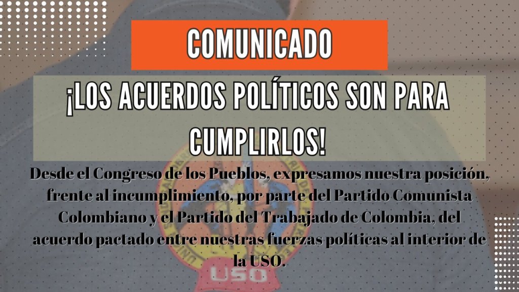 Bajo dichas premisas en las pasadas elecciones internas de la USO de diciembre del año 2022 y una vez sentenciado el resultado electoral, se produjo y se firmó un acuerdo entre tres reconocidas fuerzas políticas: El Congreso de los Pueblos CDP, el Partido Comunista Colombiano PCC y el Partido del Trabajo de Colombia PTC denominado: “UN ACUERDO POLÍTICO POR LA VIDA, LA PAZ, LA DEMOCRACIA SINDICAL Y LA CONMEMORACIÓN DE LOS 100 AÑOS DE LA UNIÓN SINDICAL OBRERA-USO CON LUCHA Y MOVILIZACIÓN”. El Congreso de los Pueblos cumplió cabalmente su compromiso durante los dos primeros años, mientras el Partido Comunista Colombiano y el Partido del Trabajo de Colombia, se han confabulado para incumplir lo acordado para el tercer y cuarto año, rompiendo de facto con el valor de la palabra, la confianza legítima y política.