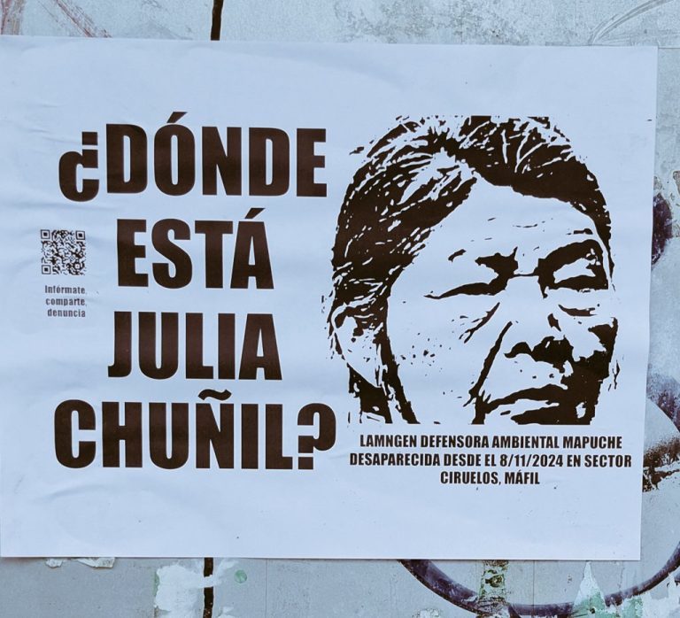 El paso de los días es crítico para esclarecer la verdad y encontrar a la defensora ambiental Julia Chuñil, desaparecida el pasado 8 de noviembre, tras vivir amedrentamientos y amenazas por negarse a abandonar el territorio de la comunidad mapuche Putraguel, que ella preside. Se trata de tierra ancestral indígena ubicada en la comuna de Máfil, región de los Ríos, que está en disputa con el empresario forestal Juan Carlos Morstadt Anwandter y CONADI, repartición pública que hasta ahora nada dice sobre el caso. Los hechos están documentados en la querella presentada por la ONG Escazú ahora en la Fiscalía Regional de Los Ríos y publicados en La Tercera y Fast Check el 11 de diciembre. Un día después, la entidad declaró reserva para la investigación, solicitada por los familiares que ahora temen por su propia seguridad.