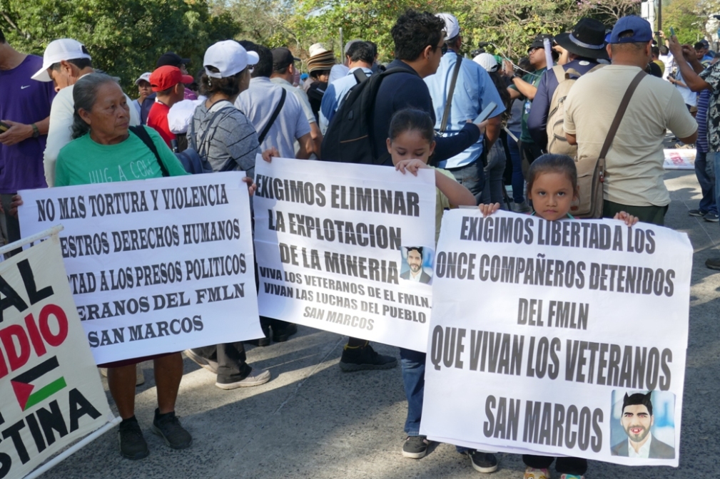 En el Aniversario 33 de la firma de los Acuerdos de Paz en El Salvador, veteranas y veteranos de la guerrilla, lisiadas y lisiados de guerra, el movimiento de las víctimas inocentes del estado de excepción, familiares de presos políticos, pueblo contra la reintroducción de la minería, defensores de los derechos humanos, violados por el régimen inconstitucional, compañeras y compañeros solidarios con el pueblo palestino, vendedores populares amenazados por el desalojo y pueblo en general marchamos el domingo 12 de enero por las calles de San Salvador para decir ¡Basta ya!