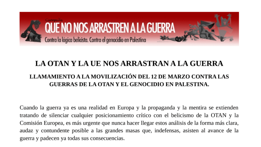 LA OTAN Y LA UE NOS ARRASTRAN A LA GUERRA LLAMAMIENTO A LA MOVILIZACIÓN DEL 12 DE MARZO. LLAMAMIENTO A LA MOVILIZACIÓN DEL 12 DE MARZO CONTRA LAS GUERRAS DE LA OTAN Y EL GENOCIDIO EN PALESTINA