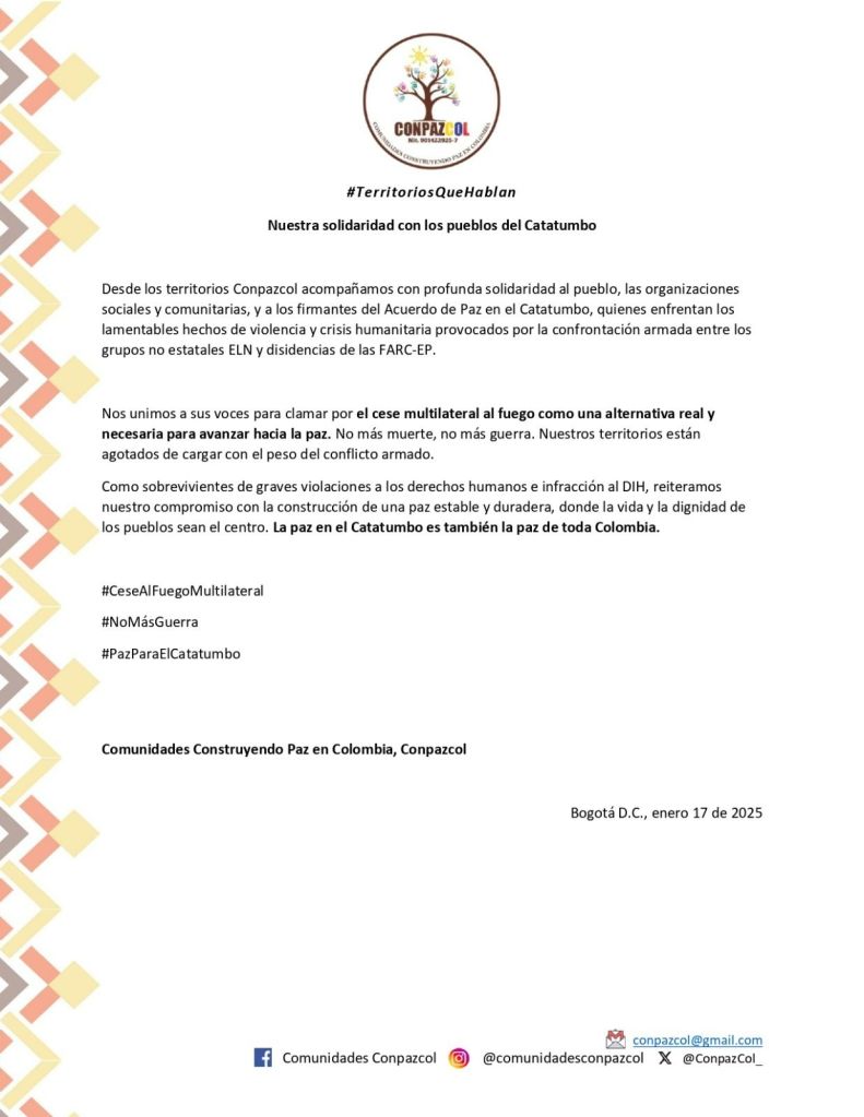 Desde los territorios Conpazcol acompañamos con profunda solidaridad al pueblo, las organizaciones sociales y comunitarias, y a los firmantes del Acuerdo de Paz en el Catatumbo, quienes enfrentan los lamentables hechos de violencia y crisis humanitaria provocados por la confrontación armada entre los grupos no estatales ELN y disidencias de las FARC-EP.