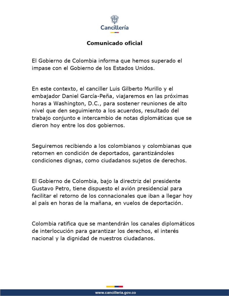 Este lunes 27 de enero el gobierno colombiano, mediando un comunicado oficial, da por superada la crisis con Estados Unidos: