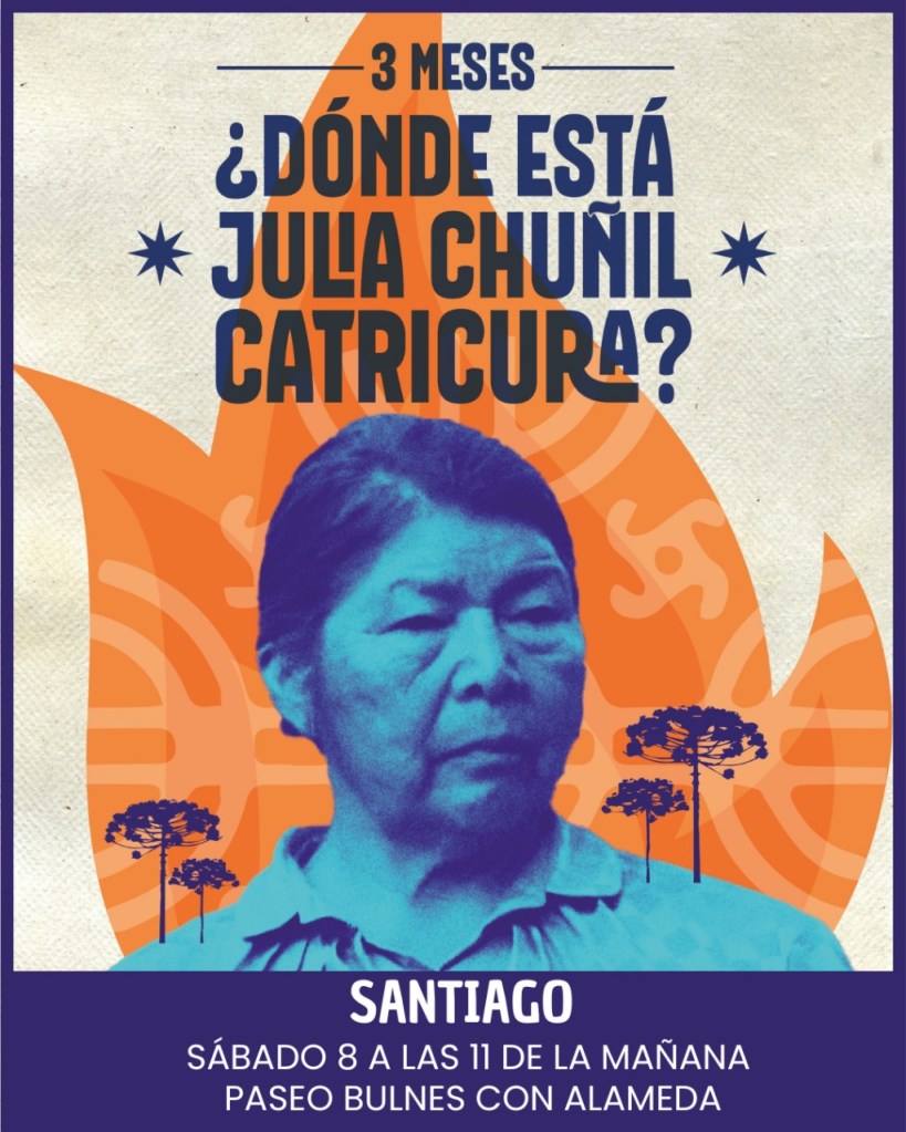 El próximo 8 de febrero, se realizará una manifestación a las 11 horas en el Paseo Bulnes de Santiago, a tres meses de impunidad sobre la desaparición forzada de la dirigente mapuche Julia Chuñil y su perro Cholito. En diversos lugares del país, habrá actividades autoconvocadas ese mismo día que serán informadas desde los territorios.