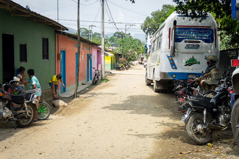 La sesión humanitaria del 4 de febrero estuvo precedida por una caravana que salió muy temprano desde Ocaña, el epicentro político y económico de la región, para llegar hasta El Tarra. A la vera de la trocha polvorienta una mujer arrastraba un bebé en un coche rosado, un raspachin exhausto descansaba sobre el costal que atesoraba su cosecha, y la puerta de una escuela rural estaba decorada con bombas y un letrero que decía bienvenidos. Pareciera que la vida y el comercio transcurre con normalidad, pero en la mirada de la gente se ve el peso de la zozobra y la desconfianza. Pareciera que estremece el ruido de su ausencia, pero la tragedia está ahí, agazapada detrás de cualquier montaña. Un joven que se gana la vida trabajando en una fábrica de arepas nos contó que dejó de hacer la cantidad de tinto habitual porque al caer la noche se le estaban quedando los termos llenos; y nos recomendó abandonar el caserío después de la seis de la tarde. En el municipio de San Pablo cada noche es una batalla contra el miedo por la incursión militar que según los rumores se avecina. Y los medios locales reportan bombardeos en diversas veredas.