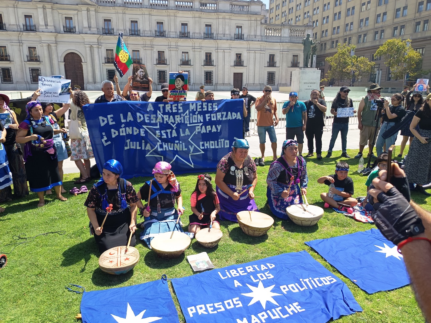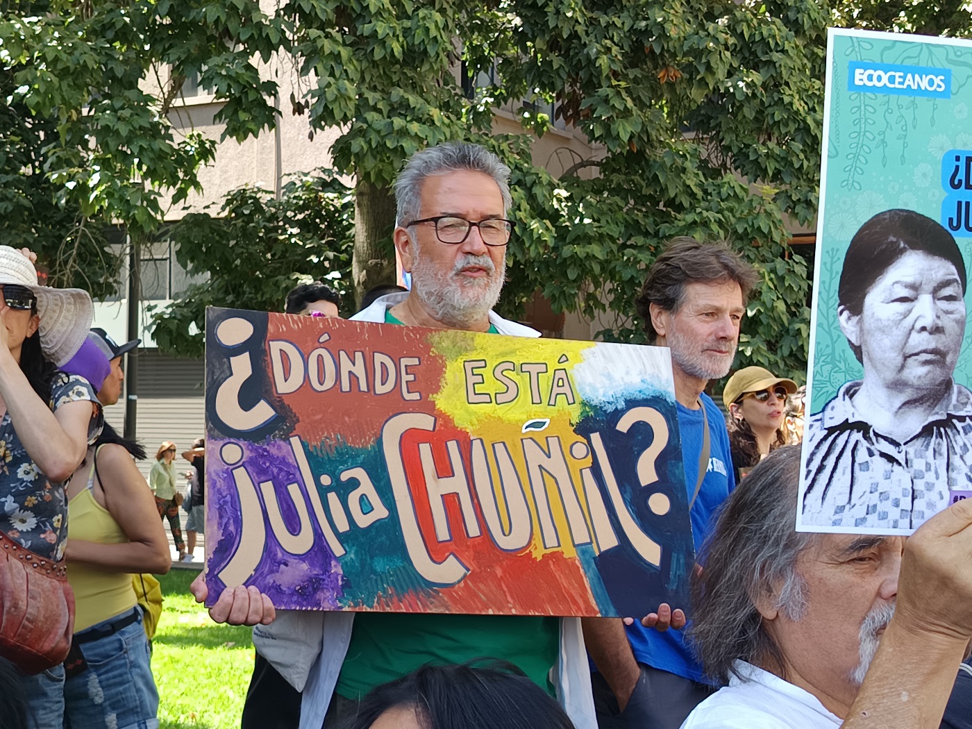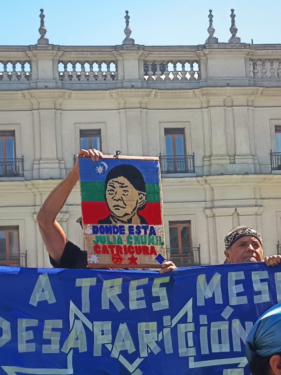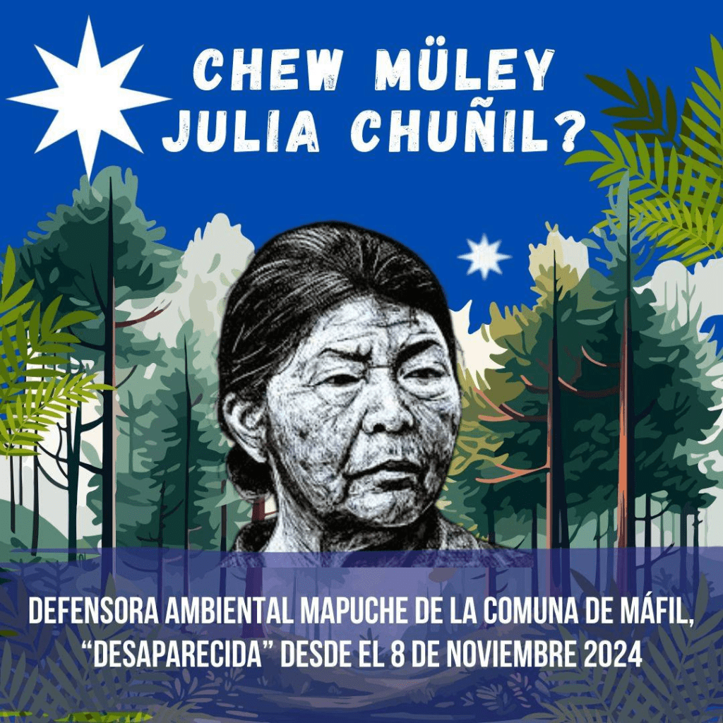 «Hoy 8 de febrero 2025 al cumplirse 3 meses de su desaparición forzada de la papay Julia Chuñil Catricura y su perro cholito, muchas voces se han alzado pidiendo, exigiendo la aparición de ella. Sin embargo los poderes del Estado no le han dado la misma importancia ni rapidez como a otros casos de desaparición ¿Porque es una mujer Mapuche defensora del territorio ? En este caso vemos una vez más a la justicia actuar de una forma clasista y racista».