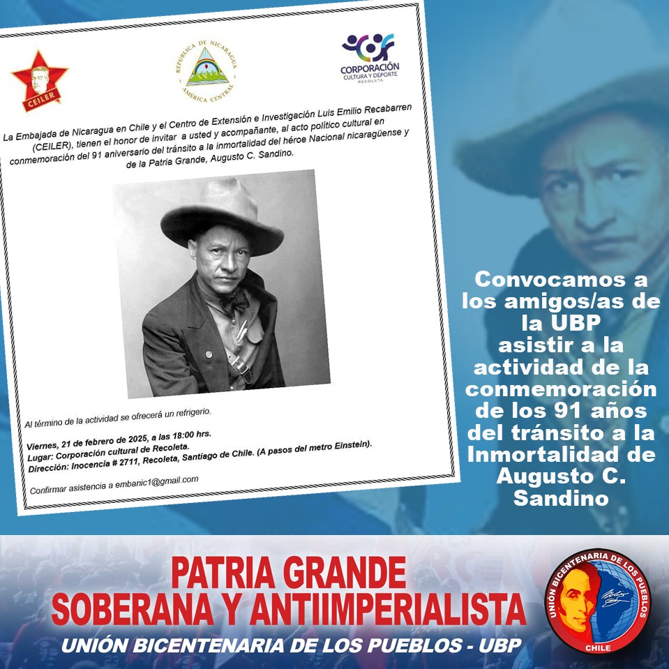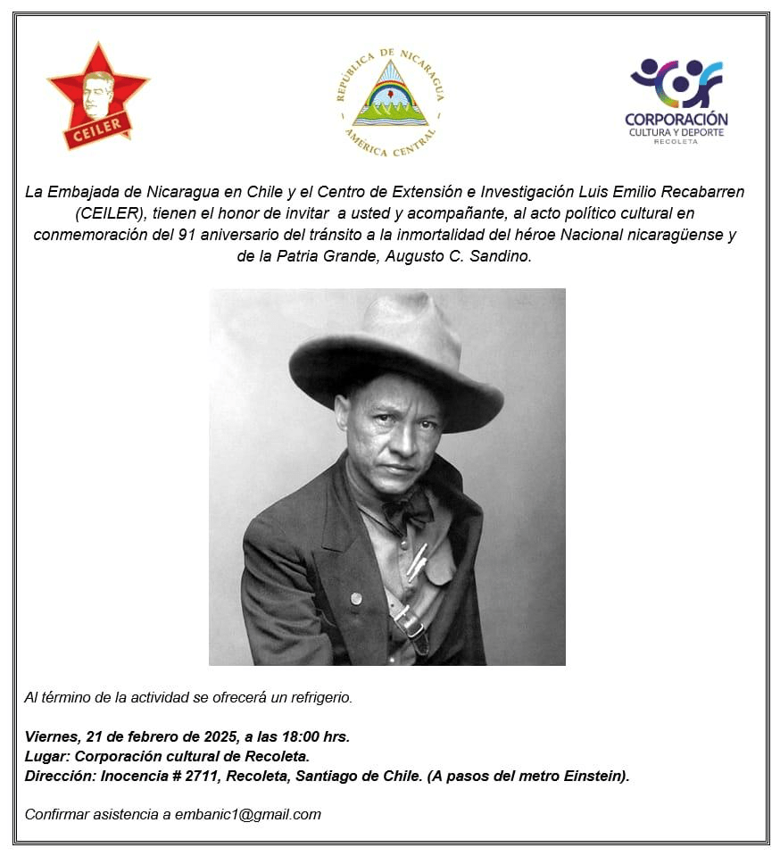 Conmemoración de los 91 años del tránsito a la Inmortalidad de Augusto C. Sandino 21 de febrero a las 18:00 horas, Corporación Cultural de Recoleta, Inocencia 2711 (Metro Einstein)