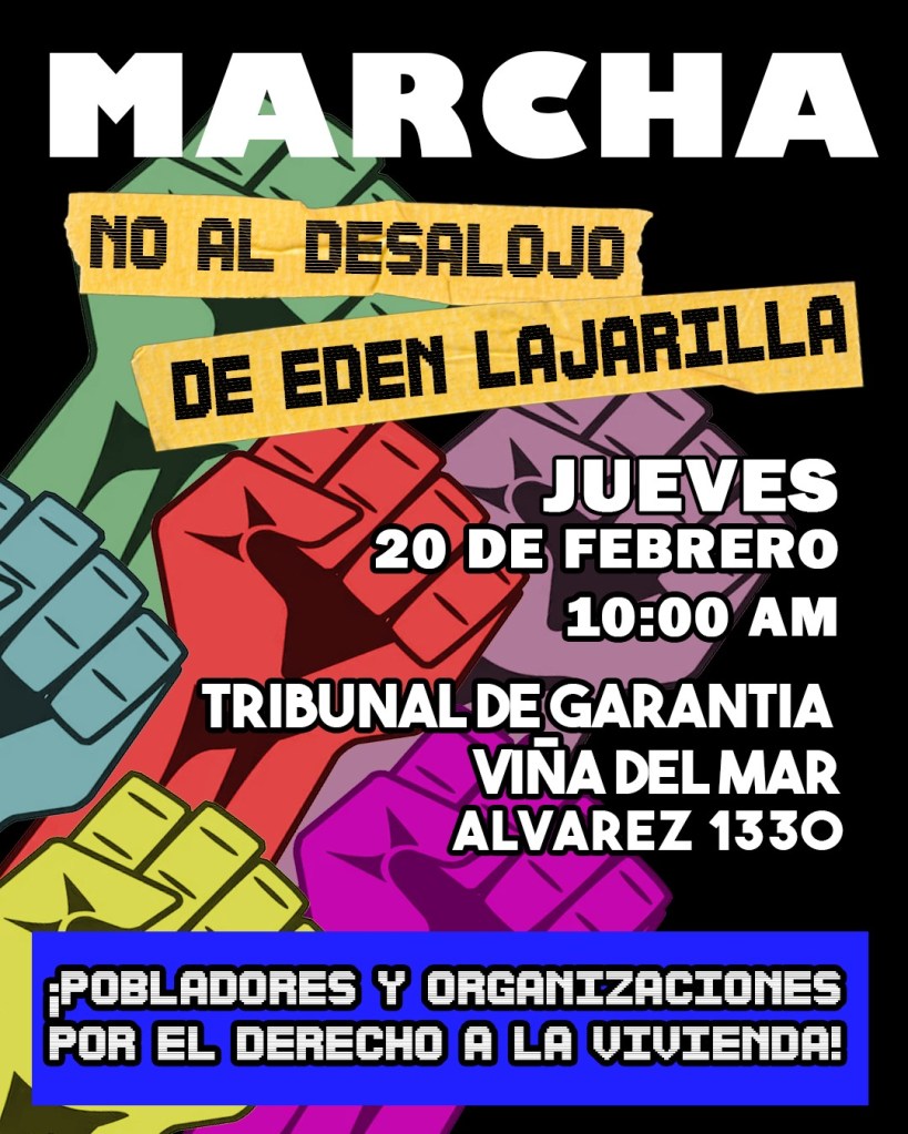 Para este jueves 20 febrero a las 10 horas am, desde los Tribunales de Garantía, ubicado en Alvarez 1330, en Viña del mar, se realizara una marcha de pobladores «Por el derecho a la Vivienda», «No al desalojo de Edén Lajarillas/Viña del Mar».