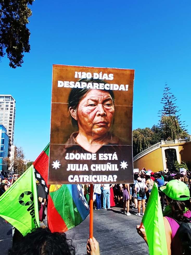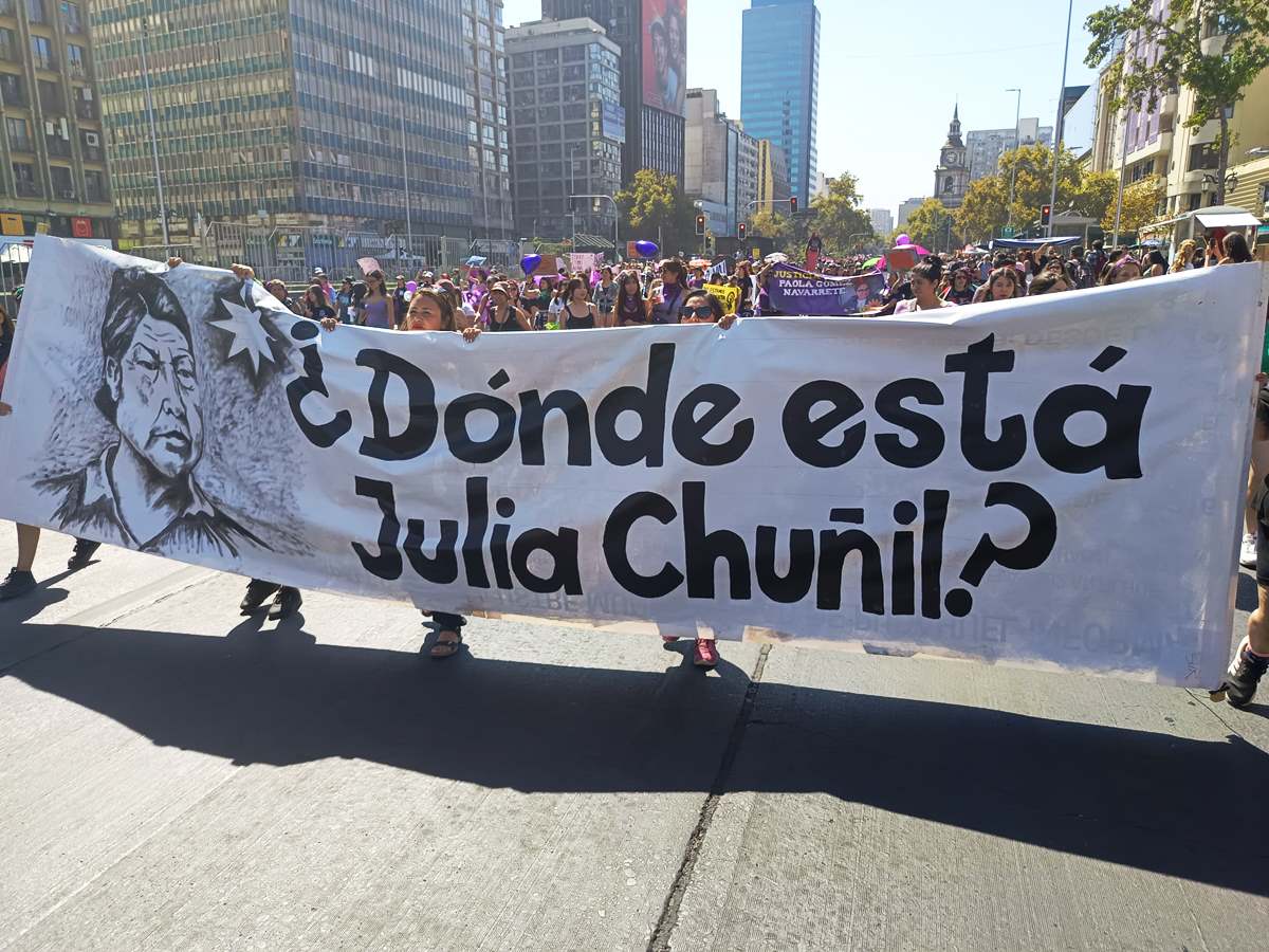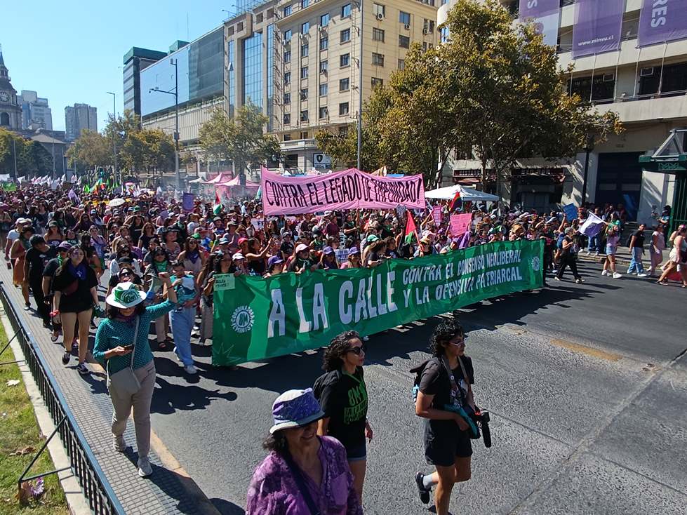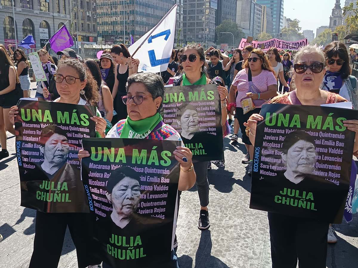 Miles de mujeres se han congregado en el centro de la capital para conmemorar el Día Internacional de las Mujeres. Destacan en la manifestación las consignas que exigen la aparición con vida de Julia Chuñil , las muestra de solidaridad con la causa palestina y el pañuelo verde por el aborto legal. Revisa esta galería de fotos y nuestra cobertura de las manifestaciones a nivel nacional e internacional.