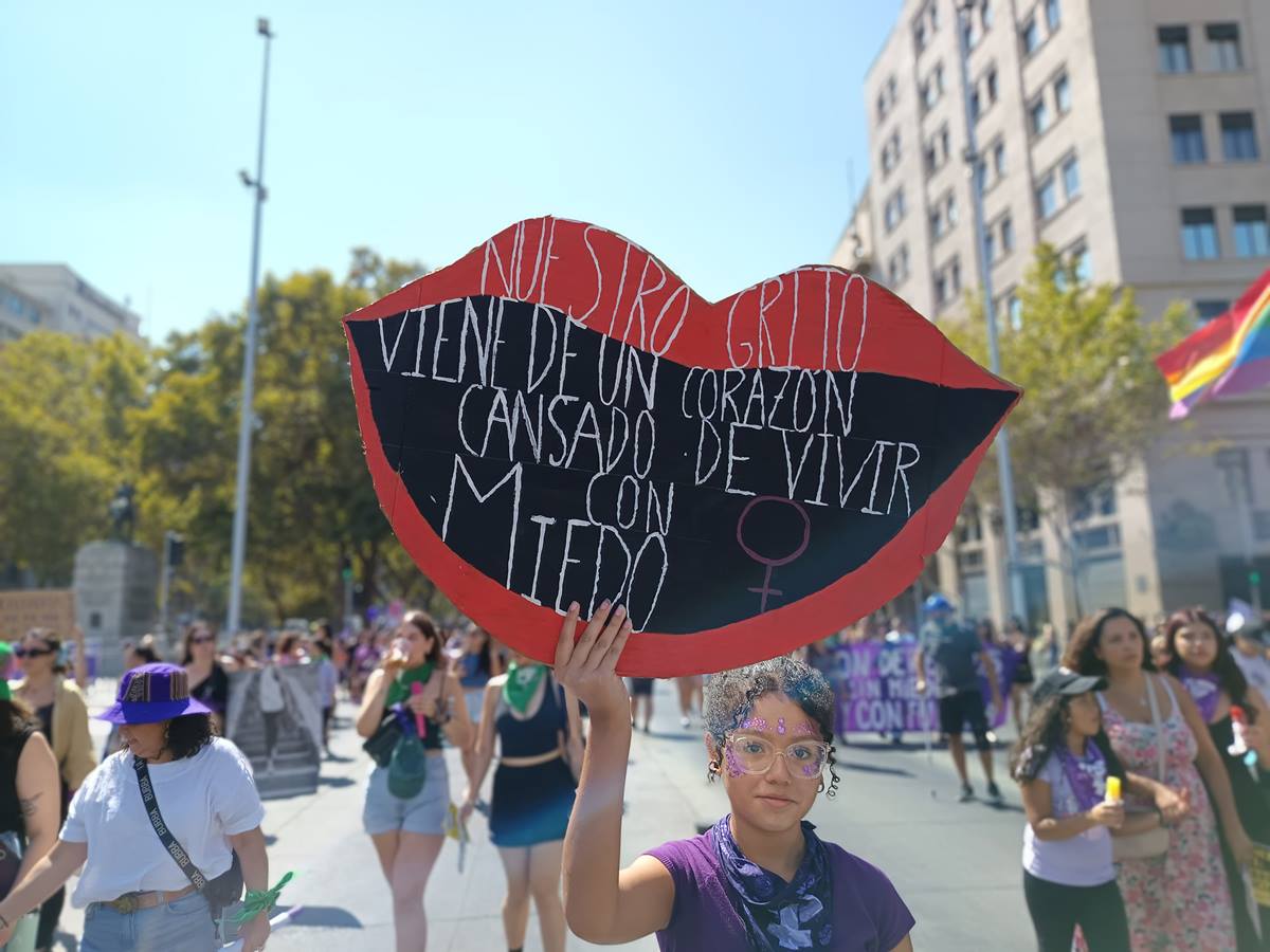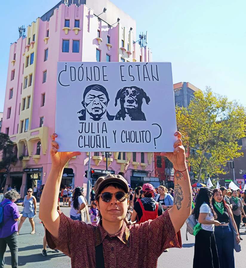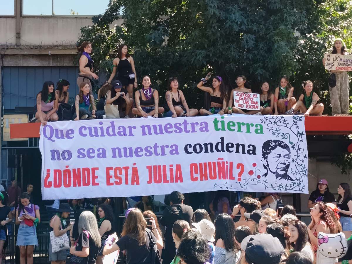 Miles de mujeres se han congregado en el centro de la capital para conmemorar el Día Internacional de las Mujeres. Destacan en la manifestación las consignas que exigen la aparición con vida de Julia Chuñil , las muestra de solidaridad con la causa palestina y el pañuelo verde por el aborto legal. Revisa esta galería de fotos y nuestra cobertura de las manifestaciones a nivel nacional e internacional.