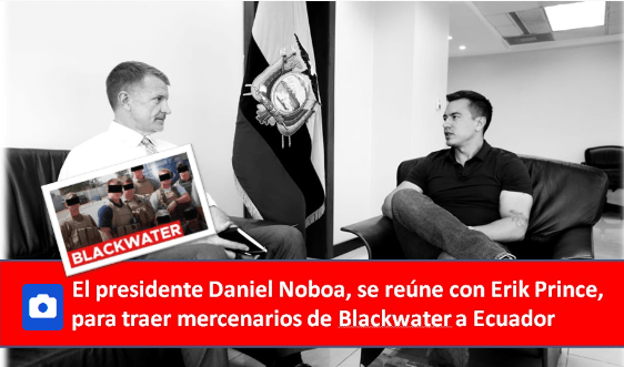 El 11 de marzo, el presidente de Ecuador se reunió con Erik Prince, fundador de Blackwater (ahora conocida como Academi), para establecer una alianza estratégica. Esta colaboración facilitará la llegada de mercenarios estadounidenses al país bajo el pretexto de «luchar contra el narcotráfico». Según declaraciones oficiales, no se ha especificado la cantidad de militares que arribarán a Ecuador.