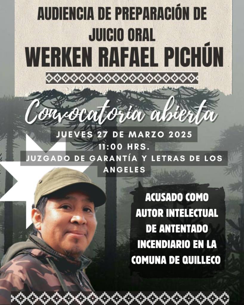 Este jueves 27 de marzo, en el tribunal de Los Angeles a las 11am, se llevará a cabo la audiencia de preparación de juicio oral del werken (vocero, mensajero) Rafael Pichún Collonao, quien se encuentra recluido en prisión preventiva desde el 12 de abril del 2024, cumpliendo ya casi un año en el Centro de Detención Preventiva, CCP Temuco.