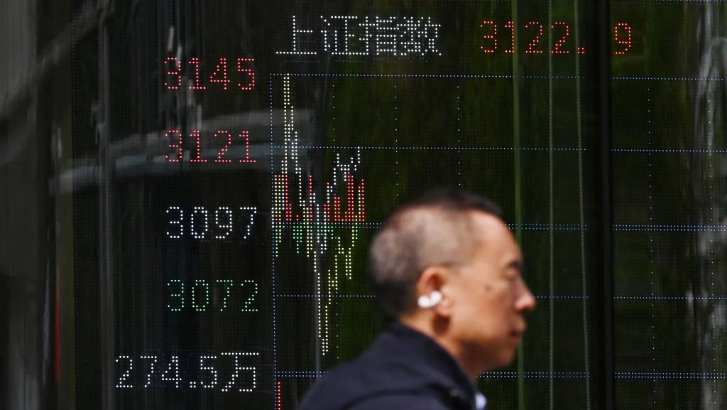 Imagen: Alguien pasa junto a una pantalla que muestra las fluctuaciones de la bolsa china de valores. Pekín, 8 de abril de 2025. (GREG BAKER/AFP).