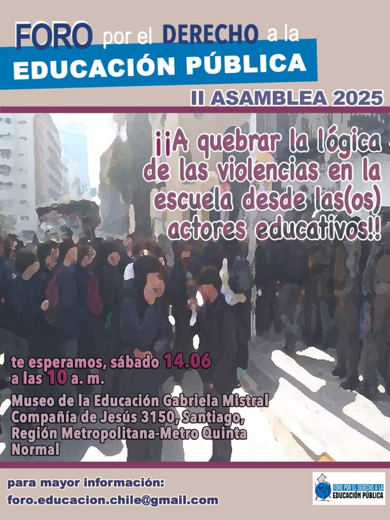 Les recordamos que este sábado 14 de junio se realizará la 2da Asamblea Nacional del Foro por el Derecho a la Educación Pública, a partir de las 10:00 hrs. en el Museo de la Educación Gabriela Mistral, ubicado en la calle Chacabuco #365, Santiago Centro – RM (Metro Quinta Normal). El tema central a discutir será sobre las violencias en el sistema educativo y cómo enfrentarlas. Como parte de los insumos para la discusión, compartimos el programa, un documento basado en el taller «El Puzzle de las Violencias» y el Informe FODEP «La expulsión y la cancelación de matrícula» realizado con diversas organizaciones educativas, sociales e investigadores militantes.